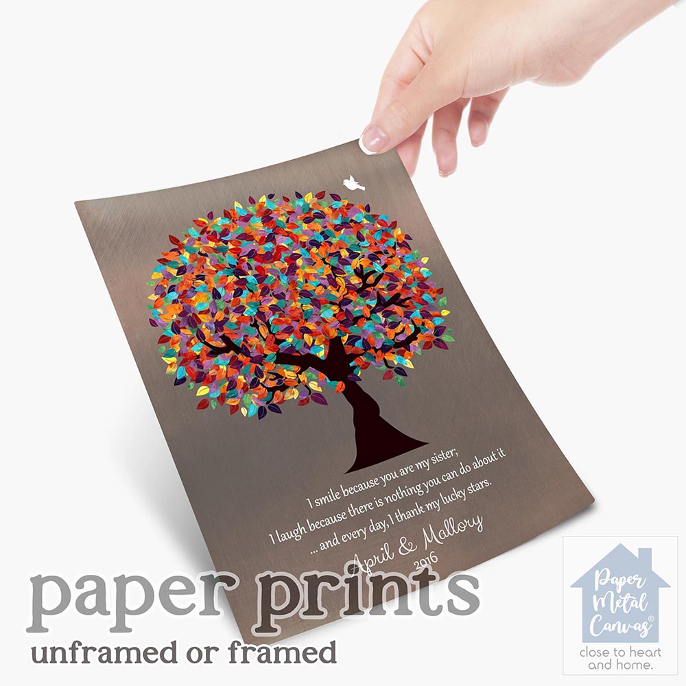Uniquely personalized colorful spring tree bronze family appreciation gift for sister, sister day, birthday and other appreciation occasions, featuring the depicted colorful sibling gratitude tree quote for sisters. Create a deeply personal gift for any sister or bridesmaid or matron of honor with your personalized names, date and text. Alternatively, this design may also be customized for an acquaintance appreciation gift, sister day, birthday or completely custom events. Anything’s possible!