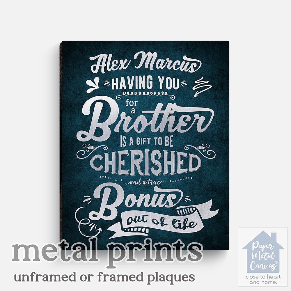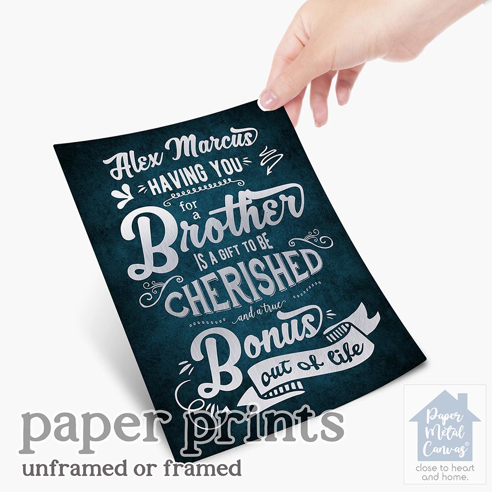 Uniquely personalized blue typography birthday gift for brother, brother’s day, wedding, graduation and other appreciation occasions, featuring the depicted a brother to be cherished and a bonus out of life. Create a deeply personal gift for any brother or brother-in-law with your personalized names, date and text. Alternatively, this design may also be customized for an acquaintance appreciation gift, brother’s day, wedding, graduation or completely custom events. Anything’s possible!