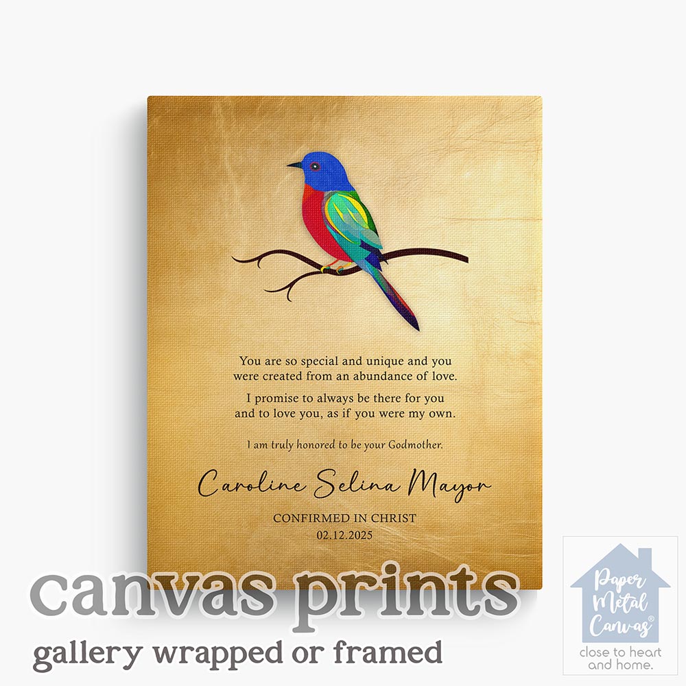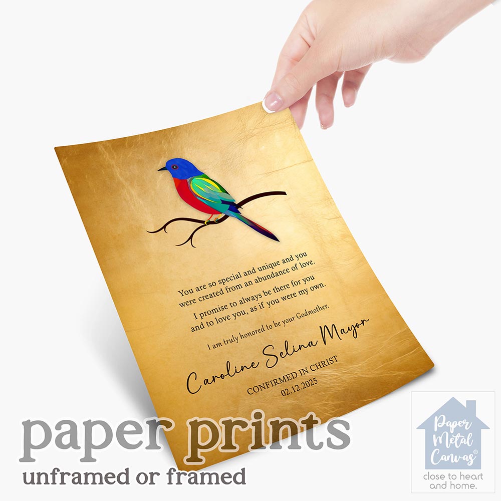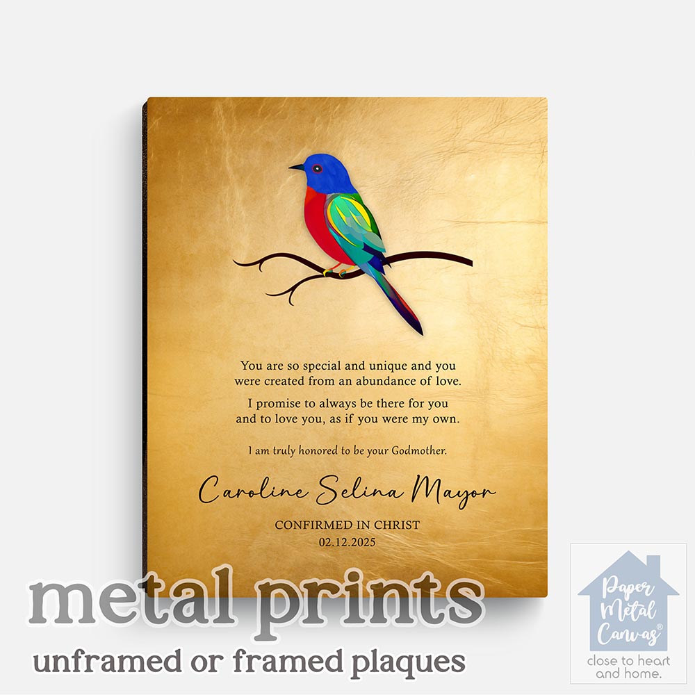 Uniquely personalized colorful bird gold faith milestone gift for child, confirmation, first communion, baptism and other faith milestone occasions, featuring the depicted like the painted bunting, you are special and unique. Create a deeply personal gift for any child or goddaughter with your personalized names, date and text. Alternatively, this design may also be customized for an acquaintance faith milestone gift, confirmation, first communion, baptism or completely custom events. Anything’s possible!