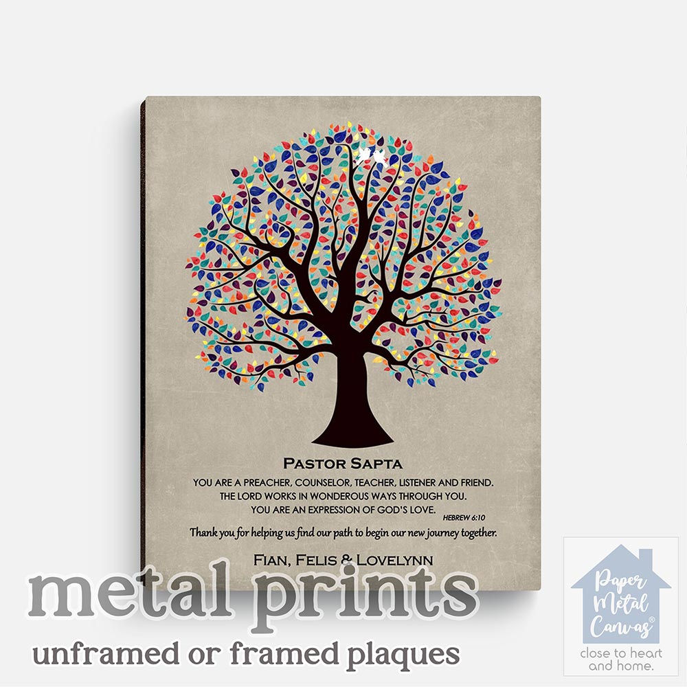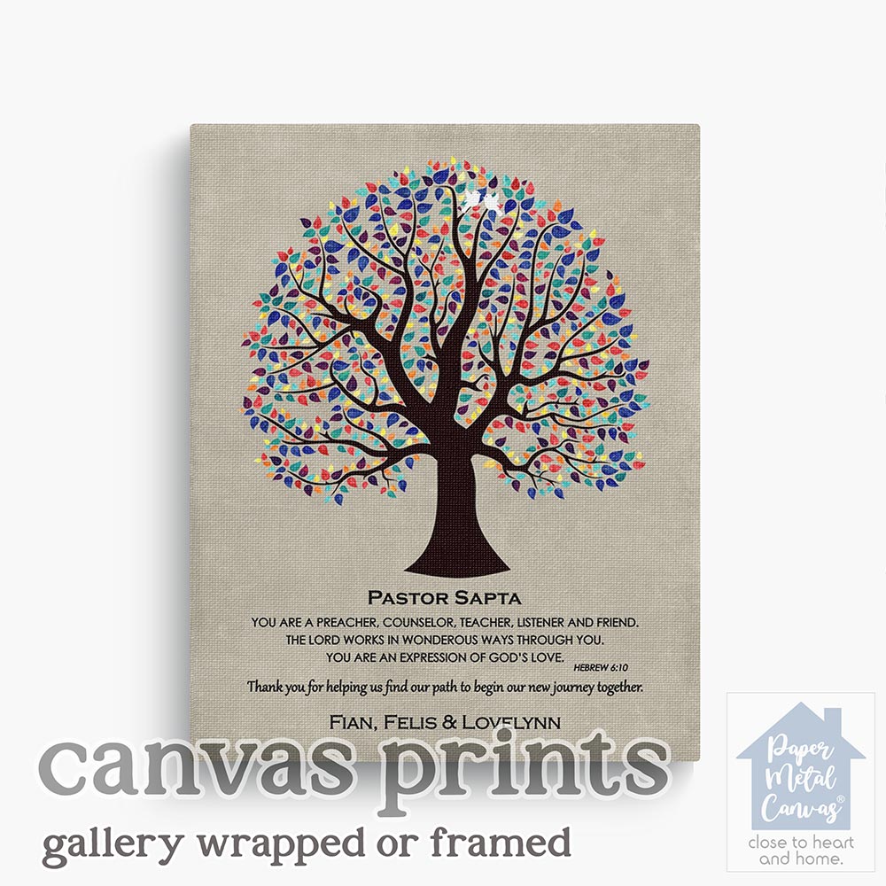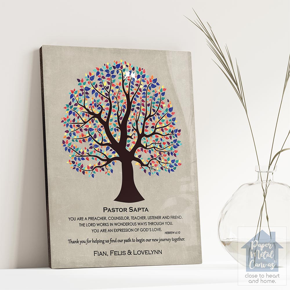 Uniquely personalized colorful decorative tree appreciation gift for pastor, confirmation, wedding and other thank you occasions, featuring the depicted colorful pastor tree scripture hebrew 6-10. Create a deeply personal gift for any pastor or pastor with your personalized names, date and text. Alternatively, this design may also be customized for an acquaintance thank you gift, confirmation, wedding or completely custom events. Anything’s possible!